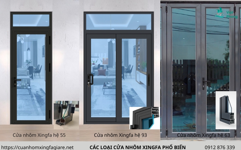 - Cửa nhôm Xingfa hệ 55: Đây là hệ nhôm phổ biến nhất, dùng cho cả cửa sổ và cửa đi.